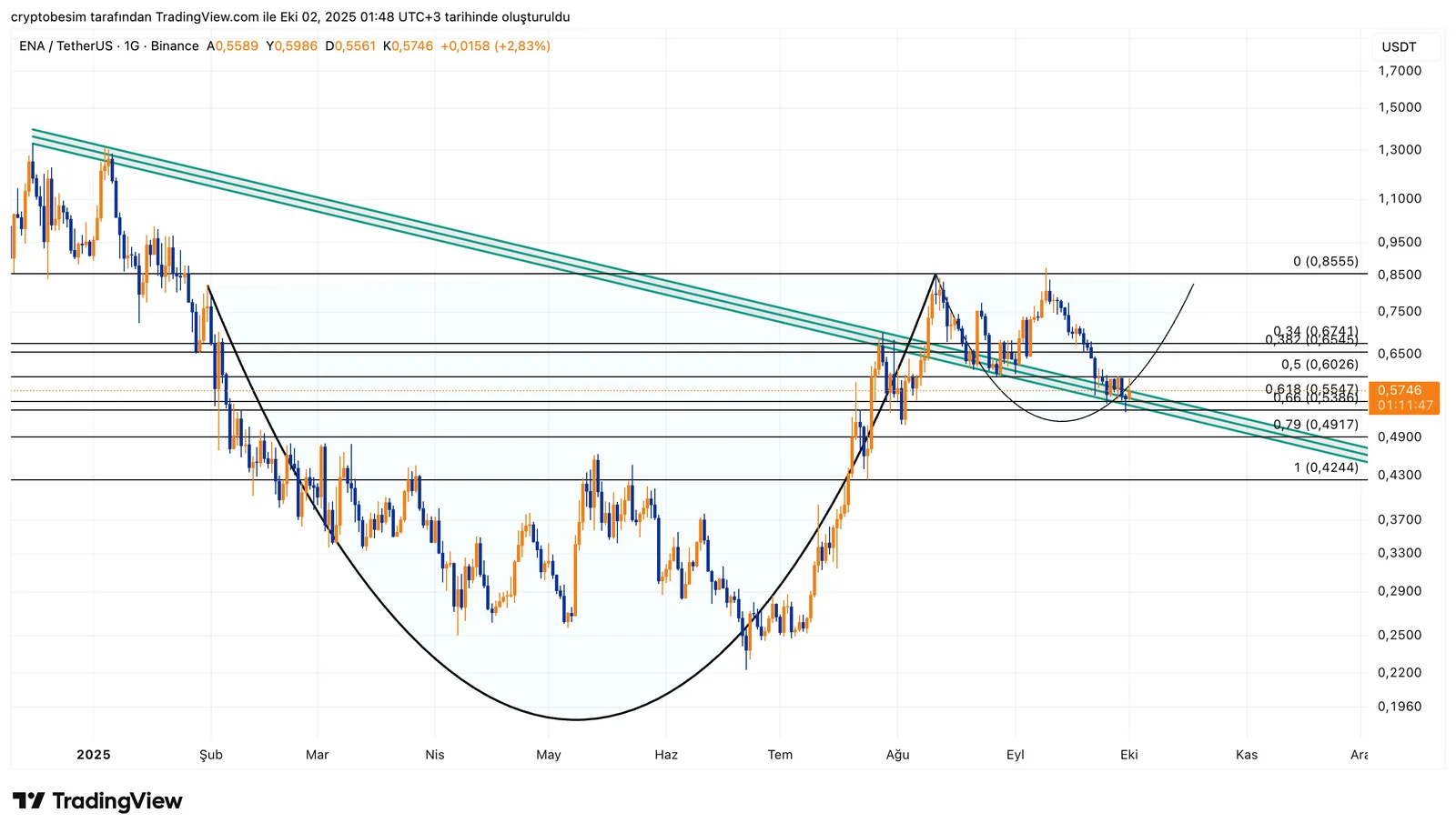 When we analyze the ENA chart, it is clear that a handle formation has begun to develop following the formation of a wide cup pattern. It is widely known that such patterns usually signal a strong trend continuation once a breakout occurs.ENA is currently trading around the level of $0.58. The handle area is forming between the levels of $0.55 and $0.62. As long as the price consolidates within this range, the pattern remains healthy, and the likelihood of a bullish breakout increases.According to a bullish scenario, it is crucial that the price breaks above the resistance level at $0.67. Above this resistance, the price could surge to $0.74 and then test the mid-term target at $0.85. If the breakout is confirmed, the pattern suggests a potential larger move toward the $2–$3 zone in the medium term.However, $0.55 stands as the most important support level. Losing this level could trigger a pullback toward $0.49 and possibly $0.42.